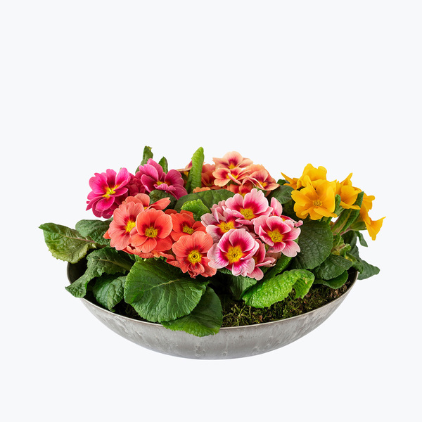 En fargeklatt man virkelig blir glad av er vårt fat fylt med herlige Primula. Send «Smaken av vår» når du vil gi mottakeren vårfornemmelser i vintermåneden!