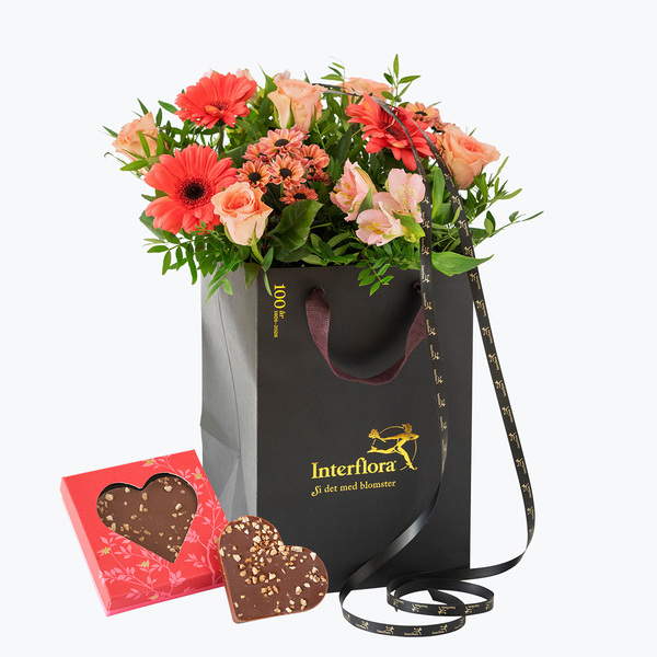 En delikat bukett av kjente blomstersorter som roser, alstromeria, germini og krysantemum. Gi bort «Stor klem» når du vil glede eller vise omtanke. Leveres sammen med et deilig nougathjerte.